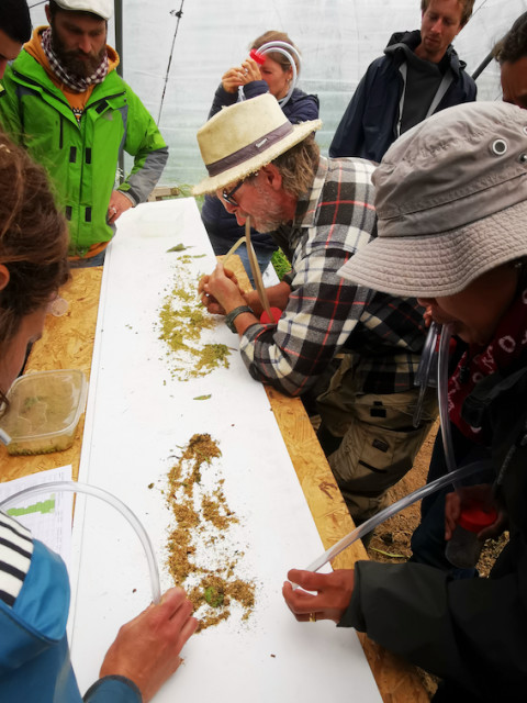 Le reste de la journée s’est donc déroulée dans les serres, où les blettes et le persil ont été volontairement laissés monter en fleurs, permettant de créer des habitats favorables aux auxiliaires des pucerons. Les insectes clés de la lutte biologique en maraîchage ont pu être capturés et identifiés grâce à l’aspirateur à insectes : macrolophus, staphylin, carabe, anthocoride, geocorus, guêpe parasitoïde, coccinelle ryzobius….