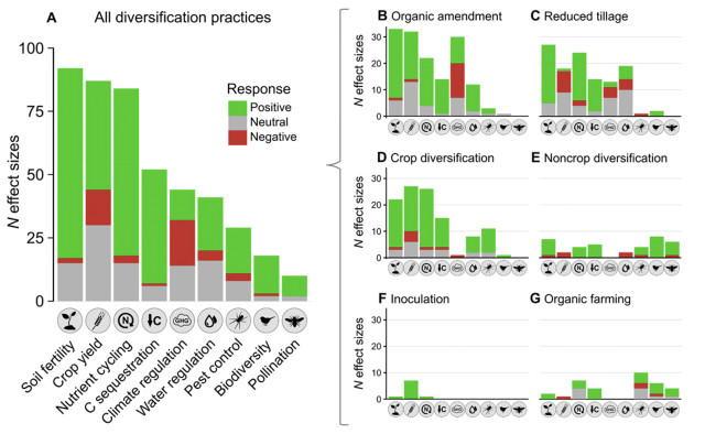 Résultat : 67% des études ont montré un effet positif, 23% un effet neutre et 10% un effet négatif. Ces effets négatifs concernent essentiellement le rendement des cultures (16%) et la régulation climatique (41%). Les effets positifs les plus importants de la diversification des pratiques agricoles concernent la fertilité des sols, le cycle des nutriments, la séquestration du carbone, la biodiversité et la pollinisation (voir graphe).
