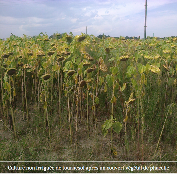 Jean-Jacques GARBAY, par exemple, est un agriculteur qui pratique systématiquement un mélange fèverole, vesce, navette phacélie en amont de toutes les cultures d'été de sa rotation : soja, maïs et tournesol. Suite à diverses expériences lourdes de conséquence, il considère maintenant que cela vaut le coup d'être attentionné et précis : cette année il a entrepris la restitution de ses couverts au 1 mai pour un semis réalisé avant le 15 juin avec des variétés précoces. Les résultats ont été remarquables sur tournesol (27 quintaux sur des boulbennes non irriguées) et normaux en soja (30 quintaux sur argilo limoneux irrigués). Sur le tournesol il y a eu deux faux semis supplémentaires pour réaliser une minéralisation tout en faisant baisser la pression adventice (le tournesol vient en deuxième culture d’été). Enfin cette année il a bénéficié d'une nouvelle herse étrille rotative, utilisable donc avec les débris provenant d'une destruction sans enfouissement. Ce travail superficiel a permis de ne pas évaporer l'eau du printemps elle même bien « rangée » dans le sol par les galeries et la structure d'un sol confié aux vers de terre et aux nombreux cheminements des racines du couvert. Pour affiner sa stratégie adventice il a semé après un épisode de pluie suivi de fortes températures.