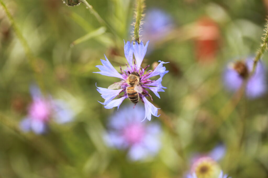 Le bleuet (Centaurea cyanus) et les coquelicots (Papaver rhœas) sont probablement les messicoles les plus connues de tous. Comme toutes les centaurées, le bleuet est extrêmement nectarifère. Sa floraison, entre juin et août, en faisait, il y a encore 50 ans une des composantes essentielles des miels “ toutes fleurs ” d’été. Les coquelicots, comme toutes les papavéracées ne sont pas nectarifères. Les abeilles, les visitent intensément pour y prélever du pollen.