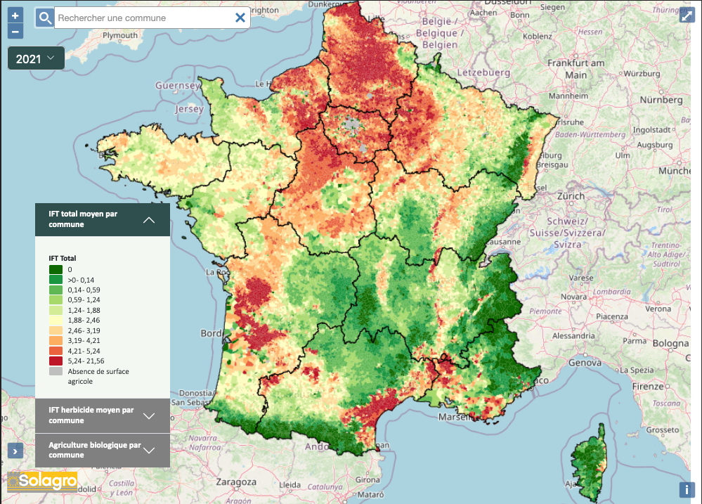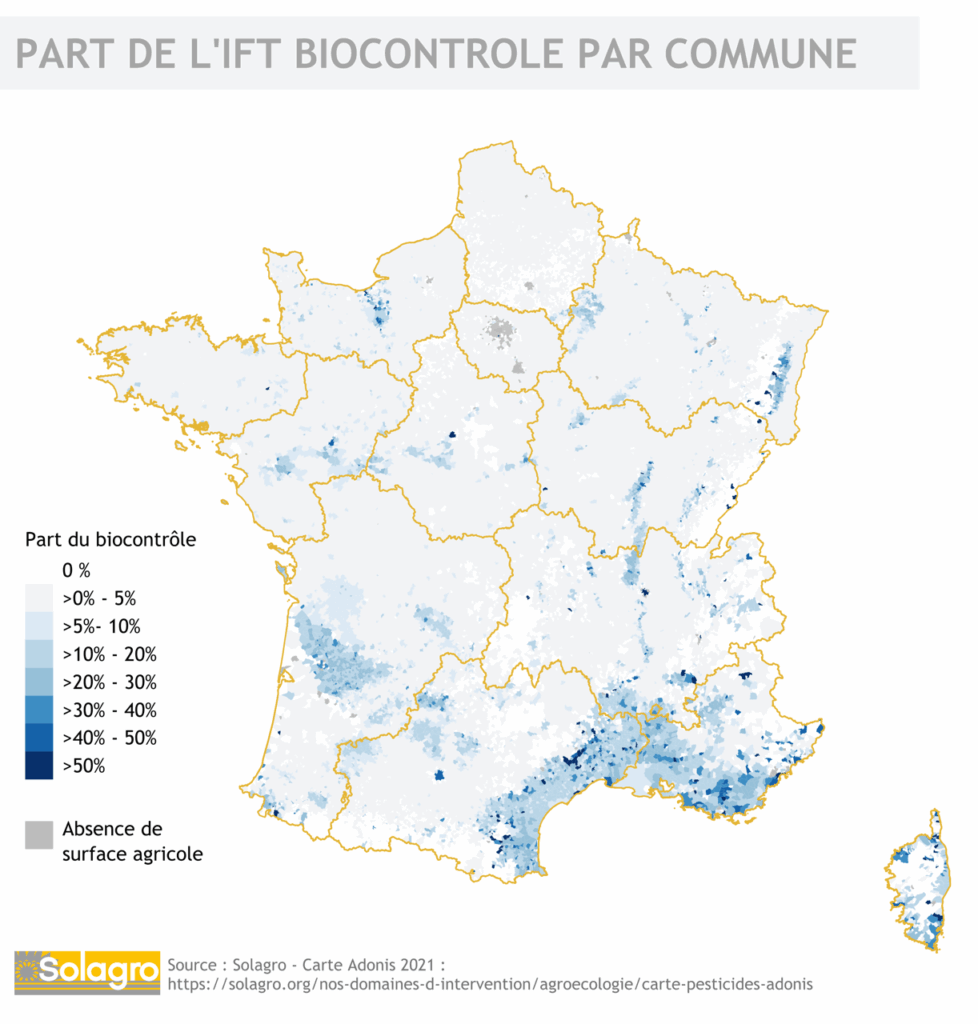 La carte Adonis répertorie les IFT moyens par commune sur le territoire français. Sur la carte de gauche, la coloration rouge correspond aux zones où l’utilisation des pesticides est la plus intensive. On peut remarquer qu’il s’agit majoritairement des zones autour de Bordeaux, du bassin méditerranéen et des plaines du Nord de la France. Ces zones géographiques correspondent aux régions viticoles, arboricoles et de cultures industrielles (pommes de terre, betterave..). Avec toutefois une belle marge de progression, il s’agit aussi des cultures les plus sujettes à l’utilisation des méthodes de biocontrôle (cf. tableau précédent). L’amplification des méthodes de biocontrôle dans ces régions apparaît donc comme un véritable levier de réduction des IFT.