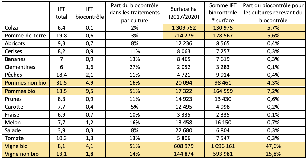 On considère que la part du biocontrôle se situe entre 3 et 5 % des IFT totaux au niveau national. Si l’on prend les traitements effectués, les cultures où les produits de biocontrôle sont le plus utilisés sont la vigne et l’arboriculture (notamment sur les pommes). Les IFT de biocontrôle par culture représentent 51% des IFT pour les vignes en AB contre 14% pour les non AB et 51% pour les pommes en AB contre 16% pour les non AB. Ces chiffres démontrent que les produits de biocontrôle sont utilisés même dans les exploitations en production conventionnelle et que par conséquent ils ont convaincu de leur efficacité.