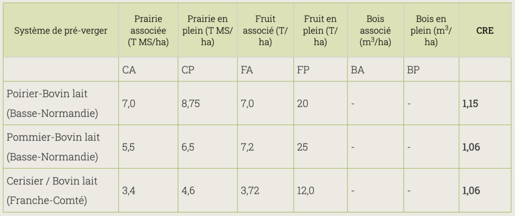 Ainsi, le CRE des prés-vergers est toujours supérieur à 1 (1,06-1,20). Ceci signifie que la productivité agronomique du pré-verger est supérieure de 6 à 20 % à celles des mêmes productions séparées.