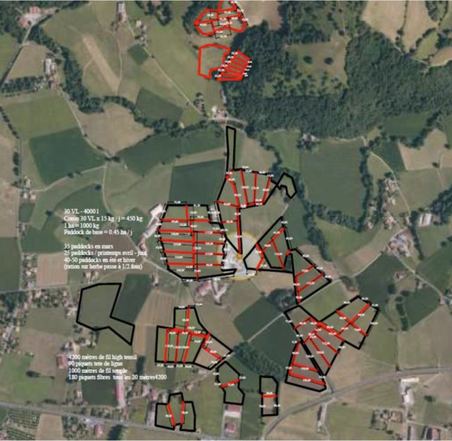 Il s’agit de travailler sur un schéma de pâturage en tenant compte de l’accessibilité, de l’approvisionnement en eau, de la pente, de la présence de haies et d’ombre, de l’appétence des espèces présentes dans les prairies, des caractéristiques pédoclimatiques (sol drainant plus facilement déprimé). Un des aspects les plus contraignants est l’accès à l’eau car tous les paddocks doivent être alimentés mais de nombreuses solutions peuvent être envisagées au cas par cas.
