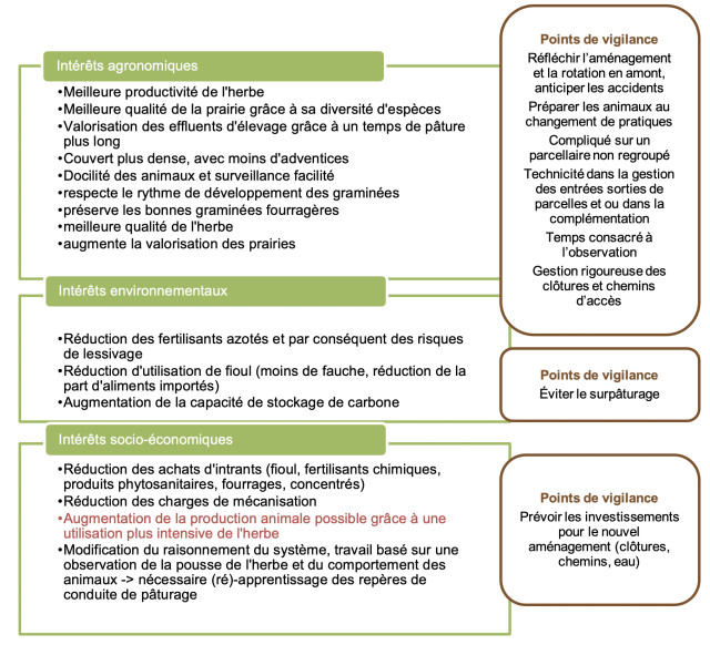 Une dépendance limitée aux intrants achetés (aliments concentrés et fertilisation minérale) est notable sur la majorité́ des élevages allaitants enquêtés. Par contre, les principales dépenses induites par le PTD sont l’installation de plus nombreuses clôtures, le réseau de cheminement du bétail et d’abreuvement en limite en paddock (entre 70 et 140 euros par hectare en système bovin) puis le temps consacré à la gestion du pâturage des différents lots.