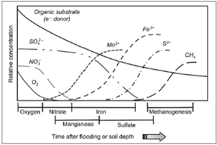 Lors d’une inondation, en fonction des caractéristiques du sol, le Eh diminue plus ou moins rapidement pour tendre vers une valeur comprise entre 0 et -200mV/ENH, caractéristique d’un sol saturé en eau. La plupart des organismes aérobies deviennent alors inactifs ou meurent. Les populations microbiennes adaptées aux environnements anaérobies se développent. Ces micro-organismes utilisent d’autres composés en substitution à l’oxygène comme accepteur d’électrons pour favoriser l’oxydation biologique des substrats organiques dans le cadre de leur respiration. La vitesse à laquelle ces accepteurs d’électrons sont consommés dans le sol dépend de leur concentration, de la présence de composés organiques facilement biodégradables et de la population microbienne impliquée dans les processus de réduction (Reddy and DeLaune 2008).