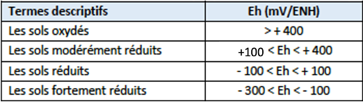 Le potentiel d’oxydoréduction (Eh) concerne l’activité des électrons. Les réactions d’oxydo-réduction (rédox) sont des réactions pour lesquelles un ou plusieurs électrons sont échangés entre les réactifs. Le réactif est appelé « Oxydant » s’il est susceptible de gagner un ou plusieurs électrons et « Réducteur » s’il est susceptible de perdre un ou plusieurs électrons. L’oxygène est l’accepteur d’électrons privilégié des micro-organismes du sol. En conséquence, l’inondation, la compaction ou l’aération des sols, en modifiant la porosité du sol accessible à l’air (AFPS), sont d’importants levier de modification de Eh. L’AFPS est très corrélée avec Eh quand celle-ci est comprise entre 15% et 40%, seuil où l’aération devient insuffisante pour l’activité microbienne aérobie. Le Eh des sols fluctue entre -300 et +900 mV/ENH. Les sols cultivés se situent le plus souvent entre 300 et 500 mV/ENH en conditions aérobies. Les Eh négatifs sont rencontrés dans des conditions anaérobies intenses typiques des sols saturés en eau de manière permanente.