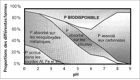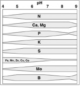 En dessous de pH 6, Fe, Mn, Cu et Zn sont facilement solubles, leur mobilité est accrue. C’est aussi le cas d’autres métaux comme l’aluminium, le cadmium, le plomb, le chrome… Le milieu peut devenir toxiques pour les plantes. En dessous de pH 5,5 ces ions métalliques peuvent réagir avec les phosphates pour donner des phosphates de fer ou d’aluminium, entraînant une diminution de la disponibilité du phosphore. Ce processus diminue aussi la biodisponibilité des sulfates, molybdates, borates et nitrates.