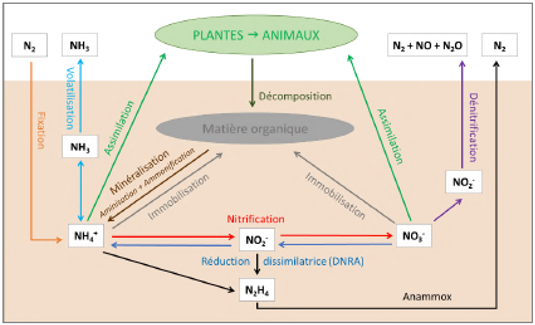 L’azote est un des macro-éléments essentiel au bon fonctionnement des plantes. C’est l’élément nutritif le plus impactant sur les rendements des cultures (Marschner 1995). Le nitrate (NO3-) et l’ammonium (NH4+) sont les deux formes d’azote disponibles pour les plantes et les microorganismes. Les nitrites (NO2) sont présents dans les sols en moindres quantités et sont toxiques pour les plantes. Les différentes formes d’azote subissent des transformations au sein du cycle de l’azote : fixation, assimilation par les plantes, minéralisation, nitrification, lixiviation, volatilisation, dénitrification… L’ensemble de ces processus sont très dépendants de l’activité biologique des sols. Tout au long de ces transformations, le degré d’oxydation de l’azote varie, ce qui en fait un élément très sensible au potentiel d’oxydo-réduction des sols (Reddy and DeLaune 2008).