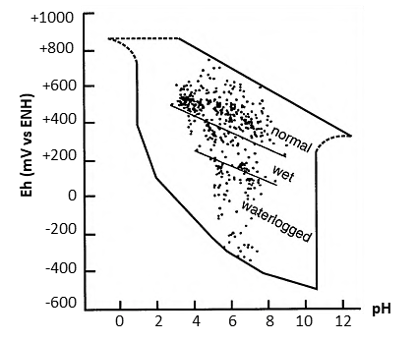 L’azote, le manganèse, le fer et le soufre sont directement impactés par le Eh du sol. Respectivement sous la forme NO3- et SO42-, N et S sont fortement mobiles dans les sols en conditions oxydées. Avec la mise en place de conditions anaérobies, la forme prédominante de N devient NH4+ et celle de S devient S2-, ce qui engendre une plus forte adsorption de N et une perte de S pour la plante. A l’inverse, présents en milieu aérobie sous forme d’oxydes insolubles, la réduction de Fe en Fe2+ et de Mn en Mn2+ améliore la disponibilité de ces deux éléments rendus solubles. Dans certaines situations une trop forte libération de Fe et Mn dans la solution du sol peut engendrer une toxicité chez les plantes.