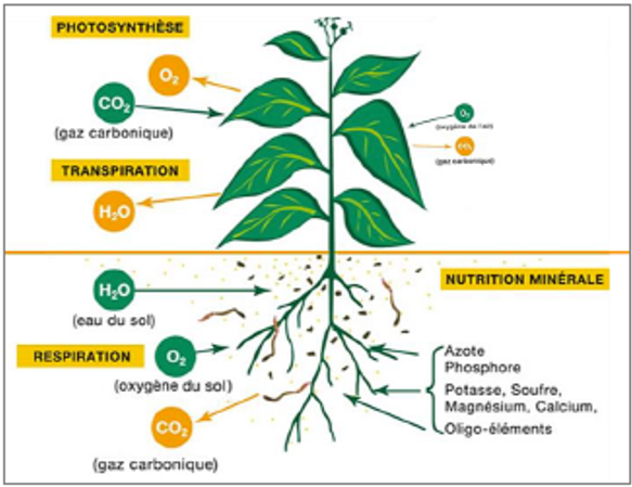 Directement impliqués dans le processus de photosynthèse, trois éléments composent 90 à 96% de la matière sèche des plantes, ce sont le carbone, l’oxygène et l’hydrogène. Les autres éléments sont des minéraux que les plantes absorbent par l’intermédiaire des racines en même temps que l’eau (Schvartz et al. 2005). Ces éléments minéraux, indispensables à la croissance des végétaux, sont divisés en deux groupes :