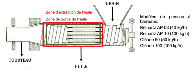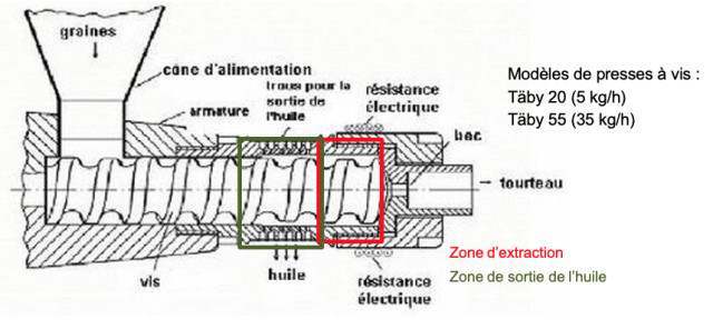 Une vis sans fin tourne dans un fourreau perforé. Les graines sont pressées à l’extrémité du fourreau par rotation de la vis sans fin. L’huile s’échappe par des trous au niveau du fourreau. Le tourteau sort en bouchons à l’extrémité de la vis.