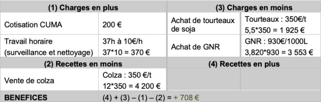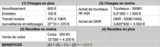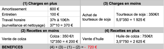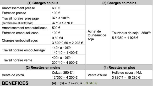 Il produit donc 12 tonnes de colza, soit 3,5 tonnes d’huile (3 820 L) et 8,5 tonnes de tourteaux. Sa production de tourteaux fermiers lui permet de substituer 5,5 tonnes de tourteaux de soja du commerce. Il achète seul pour 6 000 € de matériel amortissable sur 10 ans (presse à vis, filtre avec pompe, trémie,  avec des prix de matière première moyens (tourteau de soja : 350€/t, graines de colza : 350€/t, huile de colza en circuit classique : 750€/t).