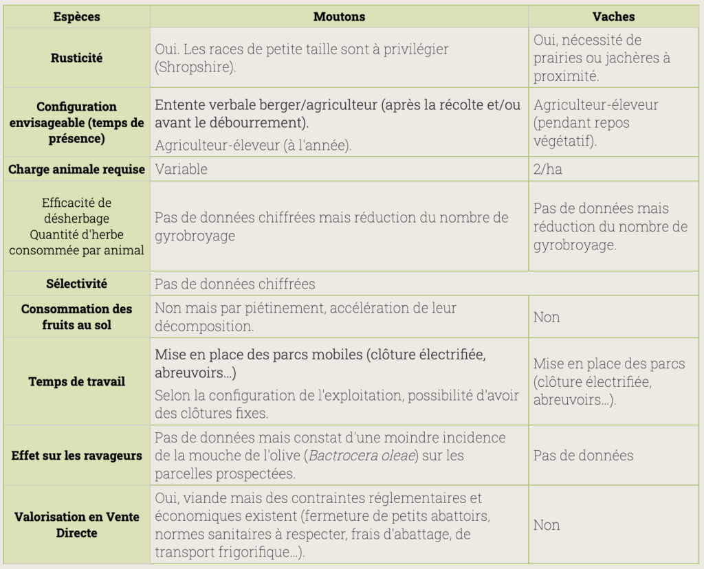 Le pâturage intervient en complément de l’entretien mécanique, soit directement après la récolte afin d’éviter que les animaux ne consomment les feuilles et les fruits, ce qui pourrait pénaliser directement le rendement de ces productions et/ou avant avant le débourrement.