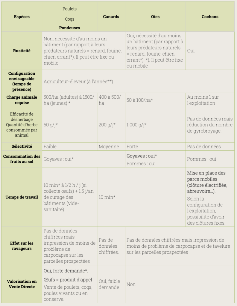Chacun présentant des intérêts et des inconvénients.Principaux élevages introduits dans les vergers ou vignobles : avantages et inconvénients. *Données issues du guide technique FREDON Martinique & CIRAD, 2013. “Associer production fruitière et élevage de volailles, une méthode innovante pour contrôler l’enherbement”. **Nécessité d’un vide sanitaire.