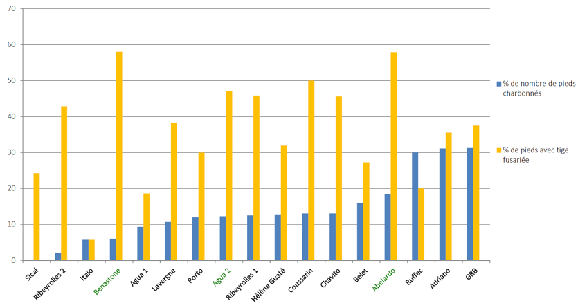 Les attaque de du fusariose sont variables d’une variété à une autre et peuvent être comprises entre 5 et 60 % d’attaques sur tige.