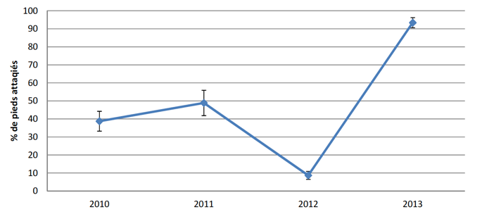 Évolution du pourcentage de pieds de maïs attaqués sur la plateforme AgroBioPérigord par la pyrale et la sésamie de 2010 à 2013