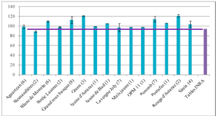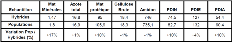 - Qualité nutritionnelle des maïs population : les essais en Rhône -Alpes montre des taux en amidon et cellulose similaires aux maïs hybrides mais présentent des valeurs supérieures en minéraux (+ 17 %) et en protéines (+ 10 % en PDIN et PDIA) que les maïs hybrides