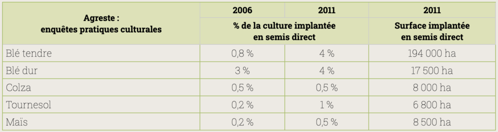D’après l’enquête 2011 sur les pratiques culturales, environ 230 000 ha étaient semés en semis-direct, essentiellement dans des résidus de culture.