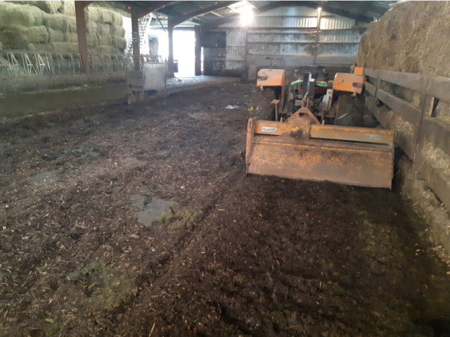 Pour les veaux, les génisses et vaches taries, Benoit étale une sous-couche de 10 à 20 cm de plaquette au départ. « On passe juste un coup de vibroculteur pour mélanger pendant les 3 premières semaines, puis au bout d’un moment quand ça sature en humidité, on paille ».