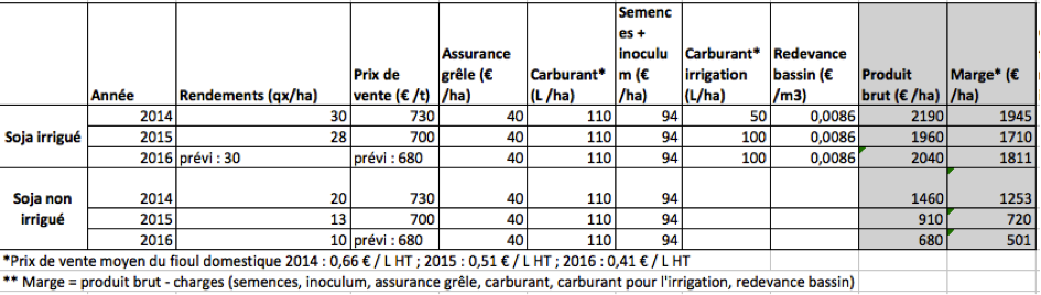 La différence entre la marge brute du soja irrigué et non irrigué est très variable selon les années et dépend de la demande climatique annuelle. Elle est en moyene de 1000€/ha sur 2014-2016.