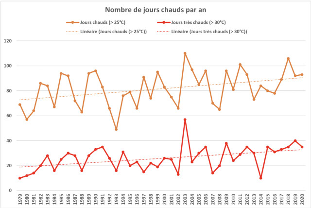 La hausse tendancielle des températures annuelles se confirme localement sur la période d’analyse, à l’image de la situation plus générale en France. Cette hausse concerne tous les paramètres (températures moyennes, minimales et maximales) et provoque ici des dégâts sur soja (voir plus bas). On observe également une hausse des jours chauds (> 25°C) et des jours très chauds (> 30°C).