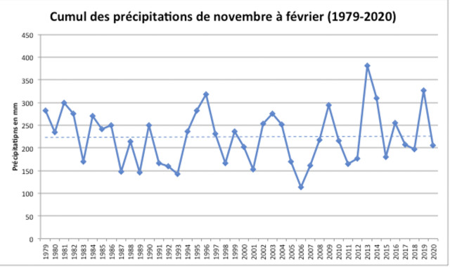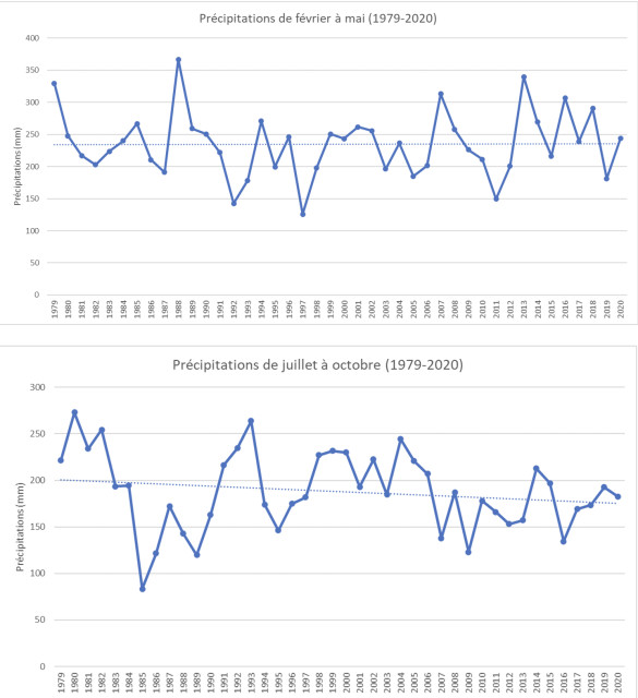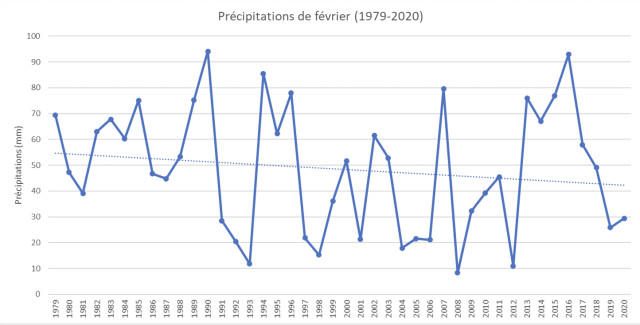 Nous avons ici les précipitations sur les deux périodes déclarées de sécheresse par Alain Daguzan, de 1979 à 2020. On remarque sur la période de février – mai que les précipitations restent constantes. En regardant mois par mois, il n’y a pas de changements significatifs de mars à mai, mais pour février les précipitations sont effectivement en baisse depuis 1979, avec une très forte variabilité interannuelle (voir ci-dessous). C’est un problème modéré pour les cultures d’hiver, en plein démarrage, qui profitent des précipitations dans les mois qui suivent. Pour la période juillet – octobre, on remarque également une baisse tendancielle des précipitations sur les 40 dernières années, avec une variabilité interannuelle qui diminue. C’est un fort enjeu pour la conduite du soja en sec sur l’exploitation.