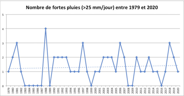 Voici le cumul des précipitations sur la période déclarée comme excédante en eau par Alain Daguzan. On ne remarque pas d’augmentation dans les 40 dernières années, même si les précipitations sur cette période ont une forte variabilité interannuelle. Le nombre de fortes pluies (> 25 mm/jour), sur le graphique ci-dessous, témoigne d’une très légère augmentation tendancielle. Ainsi, l’aléa d’excès d’eau ne se remarque pas vraiment avec ces données, même si les dernières années (depuis 2018) semblent correspondre aux déclarations d’Alain Daguzan.