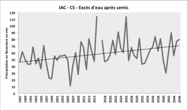 Cet indicateur présente le cumul des précipitations durant le mois de Novembre, qui évalue donc le risque d’excès d’eau après le semis de blé. Une quantité d’eau stagnante entraîne un déficit d’oxygène pour la plante : or les premières étapes du cycle de développement (germination – levée) sont très sensibles à l’hypoxie. Plus ce phénomène d’ennoiement continu perdure, plus les impacts seront importants, du retard de développement jusqu’à la destruction des pieds au-delà de 10 jours consécutifs, notamment pour le blé. C’est donc un aléa critique pour le blé tendre d’hiver de l’exploitation. À l’horizon 2050 et d’après les projections, ces précipitations deviennent plus irrégulières et variables, avec une tendance à l’augmentation. Ainsi, si le risque d’excès d’eau semblait modéré sur les observations passées (voir plus haut), il sera de plus en plus problématique d’après ces projections.