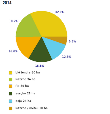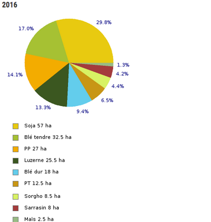 4ans de luzerne à blé (dur ou tendre) à CV moutarde/tournesol à CV féverole à sorgho à blé tendre ou blé dur (selon celui d’avant) à CV moutarde/tournesol à  CV féverole à soja