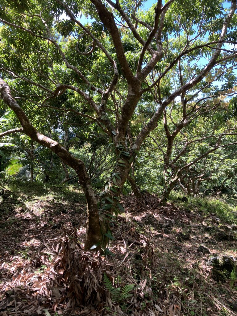 Dans le cadre de la restauration écologique sur la concession des Donnay, une centaine de letchis étaient présents. Ces arbres ont une trentaine d’années et sont de nouveau en production depuis une dizaine d’années. Aujourd’hui, une haie plantée d’espèces indigènes (300 m environ – 17 espèces) délimite les parcelles de vanille et de letchis.