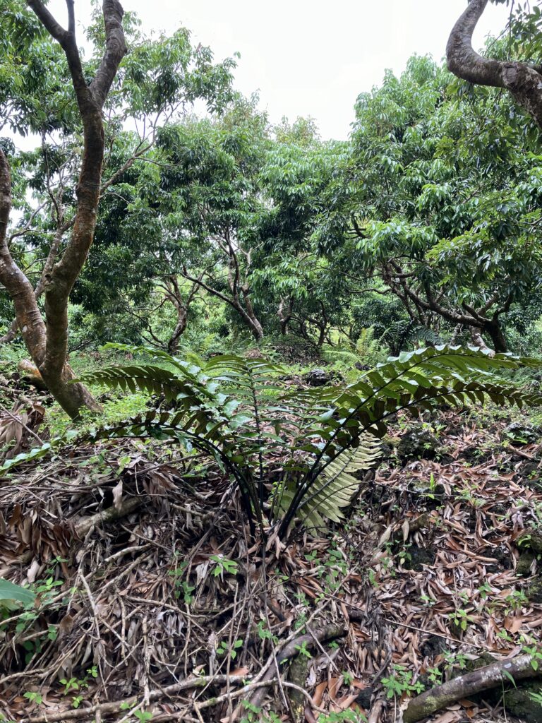 L’ombrage créé par les letchis est différent de celui fait par les palmistes rouges ou bois de gaulette et laisse moins de lumière au sous-bois. Bien que les EEE soient également présentes comme le tabac bœuf, la gestion de la strate herbacée semble moindre mais non pas sans efforts.