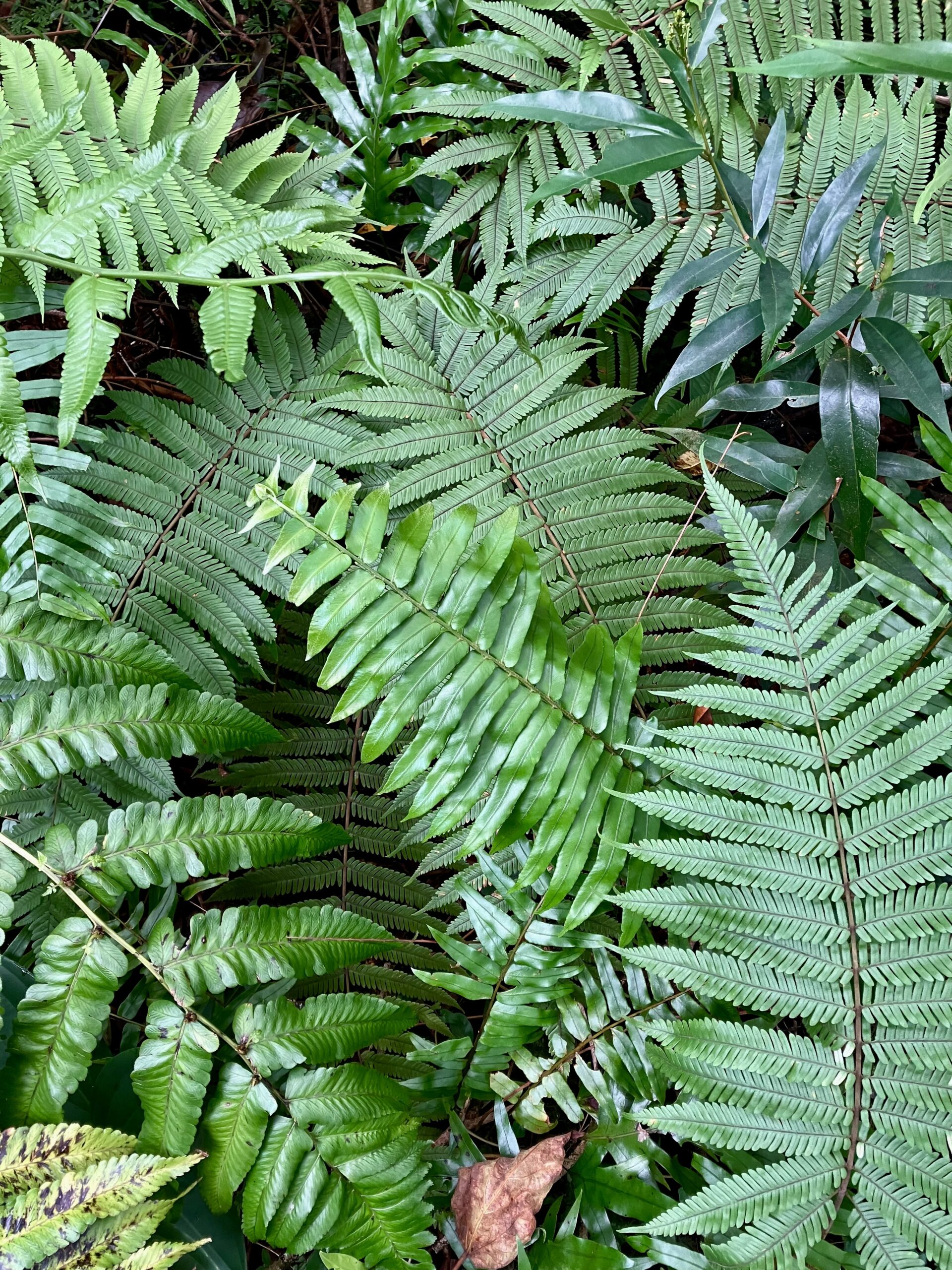 Les Donnay observent une grande diversité d’espèces de fougères sur leur terrain. Le comportement invasif de certaines espèces herbacées sous certaines fougères semble être limité.
