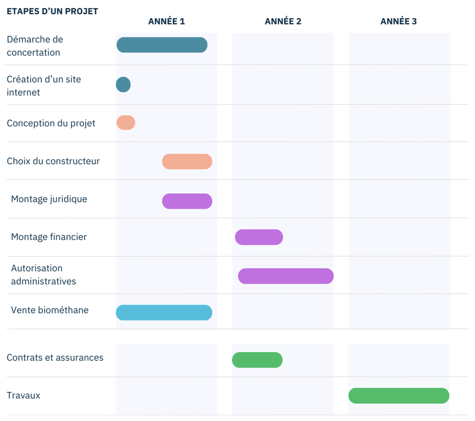 Plusieurs catégories de tâches sont menées plus ou moins en parallèle sur plusieurs années, avant d’aboutir à la mise en service d’une unité de méthanisation. La planification d’un projet type est illustrée ci-dessus, mais la durée de chaque tâche varie d’une situation à l’autre. Les principales phases de la planification seront reprises plus en détail en suivant, et illustrées par le cas de Biométhadour.