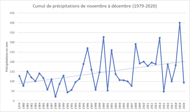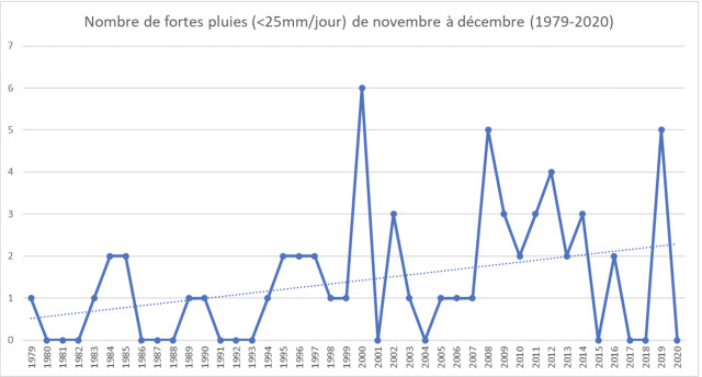 Voici le cumul des précipitations sur la période déclarée comme excédante en eau par l’agricultrice. La tendance sur les 40 années est à l’augmentation, avec une forte variabilité interannuelle sur les 10 dernières années environ. De plus, le graphique ci-dessous, qui présente le nombre de fortes pluies (> 25 mm/jour) sur la période novembre-décembre, présente également une augmentation. Ainsi, on remarque sur les deux graphiques que l’année 2019 ressort bien (5 fortes pluies notamment) ; elle avait été relevée comme remarquable par Blandine Prache-Arcusa.