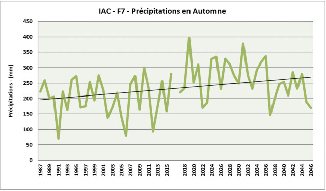 Cet indicateur présente les précipitations automnales, période relevée par Blandine Prache-Arcusa comme excédante en eau en 2019. On remarque que les précipitations sur cette période vont augmenter d’après ces projections à l’horizon 2050. L’aléa d’excès d’eau sera donc sûrement renforcé.