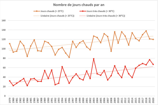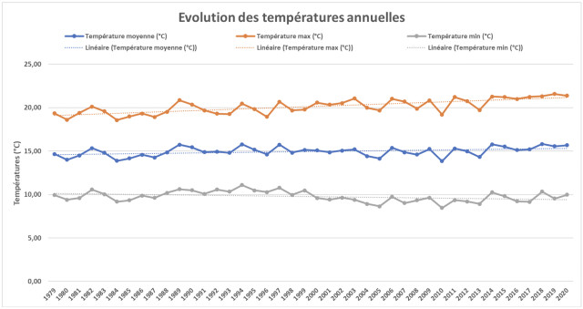 La hausse tendancielle des températures annuelles se confirme localement sur la période d’analyse, à l’image de la situation plus générale en France. Cette hausse concerne tous les températures moyennes et maximales, et ne provoque pas vraiment de dégâts sur la production d’après Bruno Dunand. Les températures minimales ont une très légère tendance à la baisse quant à elles. On observe également une hausse des jours chauds (> 25°C) et des jours très chauds (> 30°C).