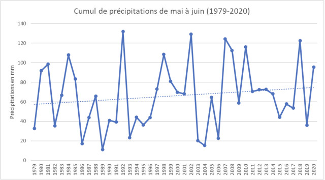 Ce graphique présente le cumul de précipitations sur la période mai-juin, déclarée par Brunon Dunand comme excédante en eau. On observe une très grande variabilité interannuelle des précipitations sur cette période, avec une tendance à la hausse. L’agriculteur déclarait que l’année 2020 avait été problématique, et on peut effectivement la remarquer sur le graphique. L’année 2018 ressort également, avec de fortes précipitations en mai-juin.