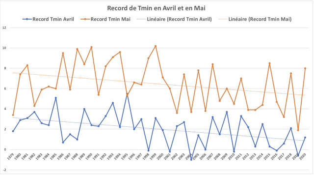 Ce graphique présente l’évolution des températures minimales d’avril et mai. On ne remarque qu’aucune des années n’a eu des températures minimales en dessous de 0 en mai, le mois relevé par Bruno Dunand. Donc le gel de mai ne se remarque pas sur ces données. On peut donc supposer des différences dues au territoire : le gel subit de 2020 par Bruno Dunand n’a pas dû avoir lieu à la station météo de la zone, les gelées devaient être très localisées. Cependant, on remarque un gel en avril, notamment en 2019, et une baisse tendancielle des températures minimales sur les 40 dernières années, alors il est possible que l’aléa de gel se fasse plus sentir dans les prochaines années.