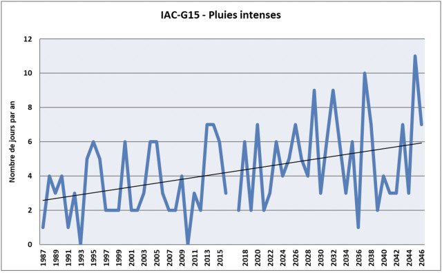 Cet indicateur présente le nombre de jours de pluies intenses sur une année : cumul journalier strictement supérieur à 25 mm. Ainsi, on remarque que ces fortes pluies tendent à augmenter dans les 30 prochaines années. Cela pourra être problématiques si certaines surviennent durant la période de floraison des oliviers.
