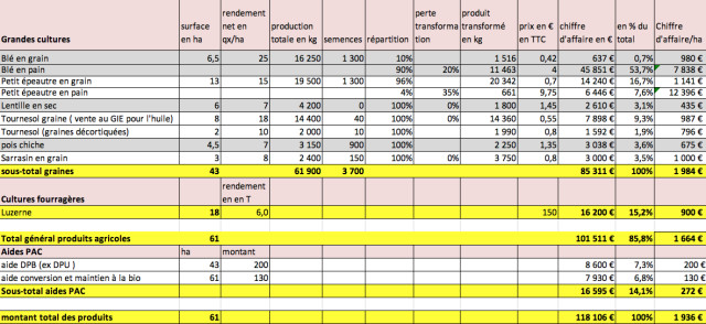 Le chiffre d’affaire du GAEC est estimé en 2015 à 123.209 € (135.000 € en 2017), soit un chiffre moyen par hectare de 2.020 €. Les aides de la PAC s’élèvent à 16.530€ (DPB et aide au maintien de la bio) soit 271€/ha de SAU. Les légumineuses à graines, le tournesol et les céréales amènent un chiffre d’affaire moyen compris entre 600€ et 1000€ par hectare. La valeur ajoutée est 10 fois plus élevée quand le blé ou le petit épeautre est transformé en pain (entre 8.000 et 12.000 €/ha). Cependant cette transformation génère des charges importantes.