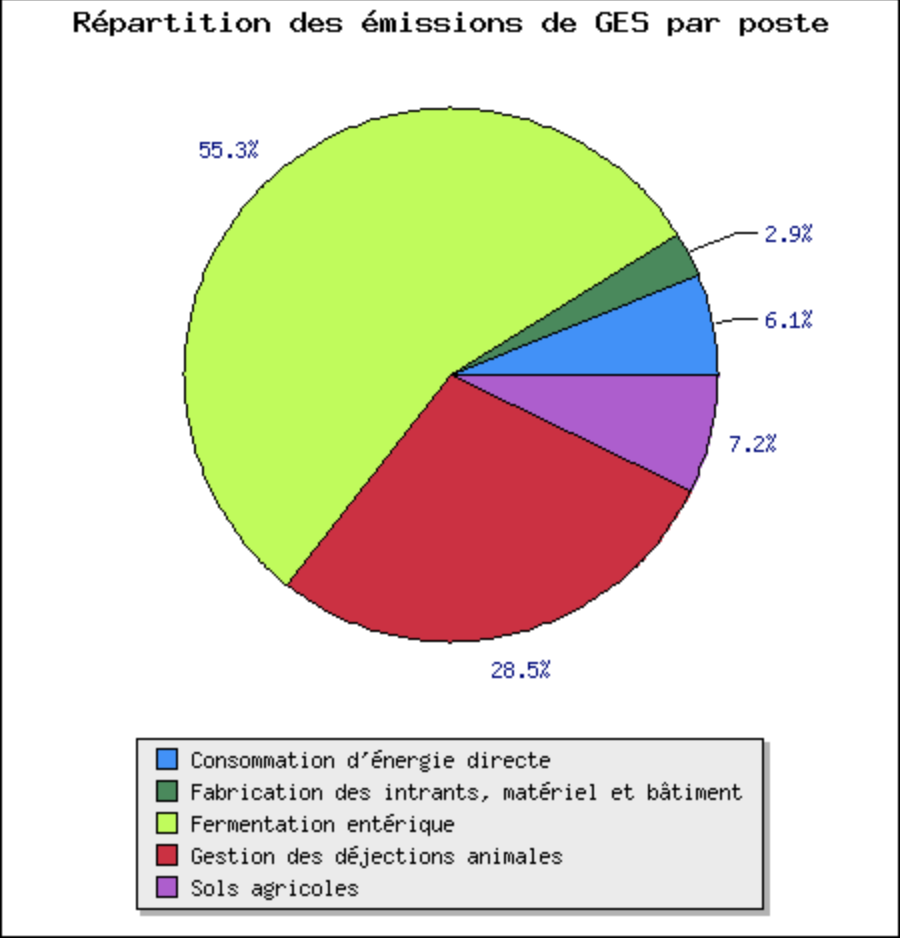 Les émissions de GES du GAEC de Bergnes sont majoritairement liés à l’activité d’élevage et le à méthane (83% des GES de la ferme) via la fermentation entérique des bovins et lors du stockage des effluents d’élevage. Viennent ensuite les émissions de CO2 (9% des GES) liées à la consommation d’énergie directe (fioul, électricité). Enfin, les émissions de N20 représentent 8% des GES, liés aux émissions directes des sols via les processus biologiques et cycle de l’azote.