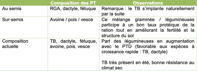 En 2021, la surface de prairies a augmenté. Désormais, il y a 17 ha de prairies naturelles et 15 ha de prairies temporaires. De plus, le troupeau est en pâturage plus longtemps : la durée du pâturage s’étend désormais de février à mi-novembre. La date de sortie est de plus en plus précoce car avec le réchauffement des hivers, le redémarrage de la pousse de l’herbe se fait plus tôt. Les temps de rotations sont également plus long. Au printemps, ils sont de l’ordre de 22 à 30 jours.