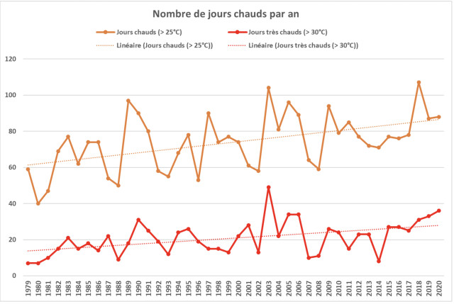 La hausse tendancielle des températures annuelles se confirme localement sur la période d’analyse, à l’image de la situation plus générale en France. Cette hausse concerne tous les paramètres (températures moyennes, minimales et maximales) et provoque ici des dégâts sur les noix (voir plus bas). On observe également une hausse des jours chauds (> 25°C) et des jours très chauds (> 30°C).