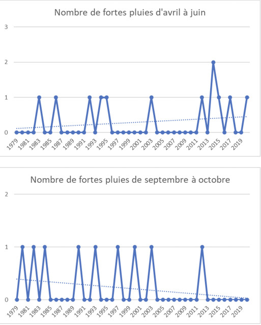 Voici le cumul des précipitations sur les deux périodes déclarées comme excédantes en eau par Jules Charmoy. On remarque une augmentation tendancielle des précipitations d’avril à juin malgré une certaine variabilité interannuelle. Pour septembre/octobre, la tendance est plutôt à la baisse sur les 40 dernières années. Pour les deux graphiques, on remarque que l’année 2020, qui a été relevée comme critique par l’agriculteur, présente effectivement des valeurs plus hautes que les années précédentes. De plus, les deux graphiques ci-dessous présentent le nombre de fortes pluies (> 25 mm/jour) sur les deux périodes, et vont dans le même sens que les précédents. On remarque une forte pluie en 2020 sur le premier graphique, on peut supposer que cela correspond aux 56 mm du 26 mai 2020, déclarés par Jules Charmoy.