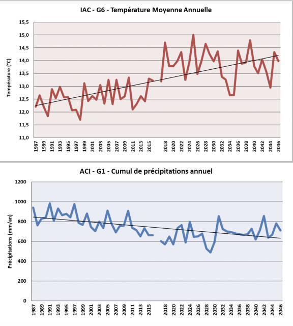 L’inertie climatique à l’échelle du globe implique une continuité des évolutions climatiques déjà observées localement dans les prochaines décennies. Les Indicateurs Agro-Climatiques suivant sont construits à partir des projections climatiques locales et illustrent les principaux enjeux climatiques pour un système polyculture poly-élevage.