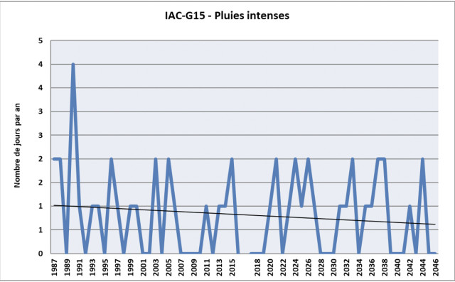 Ces deux graphiques présentent les projections des précipitations d’automne et de printemps à l’horizon 2050. Ainsi, on remarque une diminution des précipitations pour les deux périodes, plus franche pour le printemps. On peut alors supposer que l’aléa d’excès d’eau reculera dans les années à venir, spécialement pour le printemps. Comme le montre le graphique suivant, les fortes pluies diminueront légèrement également. Pour l’automne, cela semble plus léger et plus variable, il faudra être vigilant, notamment pour les cultures d’hiver.