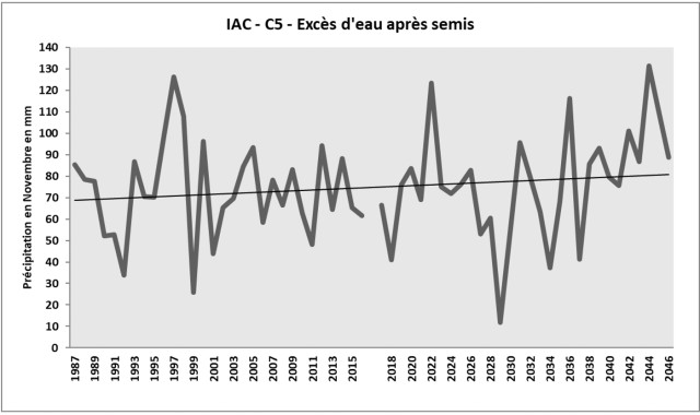Cet indicateur présente le cumul des précipitations durant le mois de Novembre, qui évalue donc le risque d’excès d’eau après le semis de cultures d’hiver, comme le blé. Une quantité d’eau stagnante entraîne un déficit d’oxygène pour la plante : or les premières étapes du cycle de développement (germination – levée) sont très sensibles à l’hypoxie. Plus ce phénomène d’ennoiement continu perdure, plus les impacts seront importants, du retard de développement jusqu’à la destruction des pieds au-delà de 10 jours consécutifs, notamment pour le blé. C’est donc un aléa qui peut être critique pour les cultures d’hiver de l’exploitation. À l’horizon 2050 et d’après les projections, ces précipitations deviennent plus irrégulières et variables, avec une légère tendance à l’augmentation. Ainsi, le risque d’excès d’eau en fin d’automne sera de plus en plus problématique d’après ces projections.