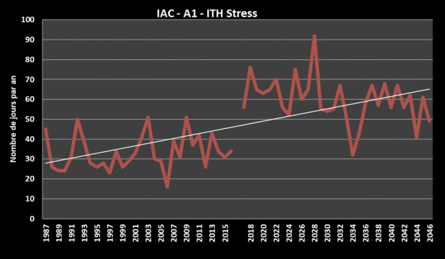 L’Indice Température Humidité (ITH) évalue le couple température et hygrométrie pour déterminer le niveau de stress thermique des animaux. Sur ce graphique figurent le nombre de jours de stress thermique par an. Ainsi, d’après ces projections, l’évolution du climat local va faire presque doubler le nombre de jours de stress thermique des animaux. Ce n’est pour l’instant pas un problème sur l’exploitation, mais cela pourrait le devenir, et ce seront d’autant plus de jours où les animaux seront moins productifs en lait et leur croissance ralentie.