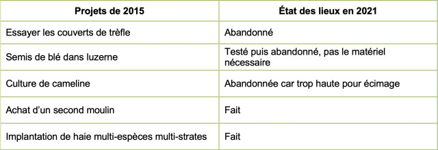 L’emploi des semences paysannes s’est encore répandu depuis 2015 sur l’exploitation. Les blés modernes et anciens sont maintenant intégralement destinés à la vente directe en farine. Les blés modernes sont transformés en farine pâtissière (T65), semi-complète (T80) et complète (T110), tandis que les blés anciens sont entièrement transformés en farine complète.
